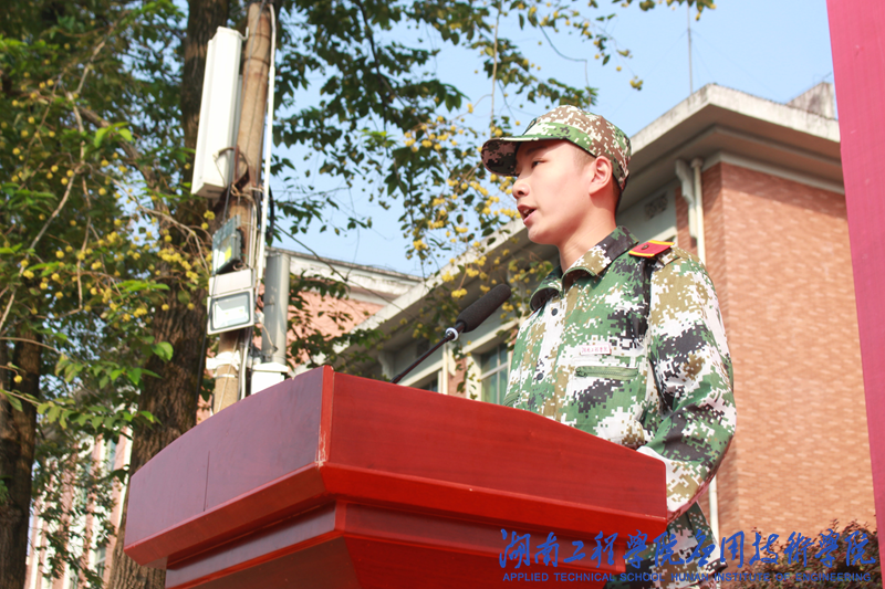 英语2081班何子敬作为军训学员代表发言,他总结了军训的苦与乐,成长和收获,并向全体新生发出号召,要担当起党和人民赋予的历史重任,在激荡青春、创造人生、奉献社会中,书写无愧于时代的壮丽华章。四营三连三排长申志蓬代表教官团发言,他祝贺同学们圆满完成军训任务,希望他们以军训为起点,在以后的学习生活中以坚持不懈和自强不息的态度直面挑战、战胜困难。退伍学生代表蒋林钢发言,作为一名退伍学长,他希望学弟学妹们继承和发扬军训中培养的优良传统与作风,努力学习科学文化知识,谨记“锲而不舍,敢为人先”的湖工校训,珍惜青春年华,勇担时代使命。