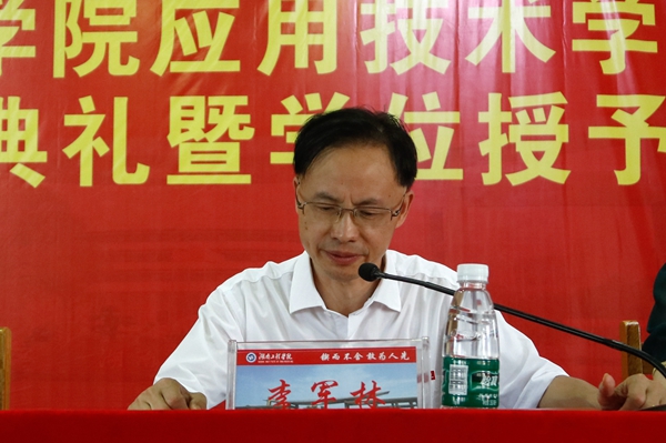 易兵作“奋进新时代阔步新征程”主题讲话,他回顾同学们学习生活中的优秀事迹,用真诚恳切的话语肯定了毕业生们在各领域所取得的骄人成绩和杰出表现,对他们顺利完成学业表示热烈祝贺,同时对即将告别母校、踏上新征程的毕业生们提出三点期望:一要做只争朝夕的奋进者、二要做敢为人先的开拓者、三要做舍我其谁的奉献者,在实现中华民族伟大复兴的征程中砥砺奋斗,贡献青春力量,实现青春价值,绽放青春光彩。真挚温暖的话语,引在座毕业生共鸣,赢来全场热烈掌声。